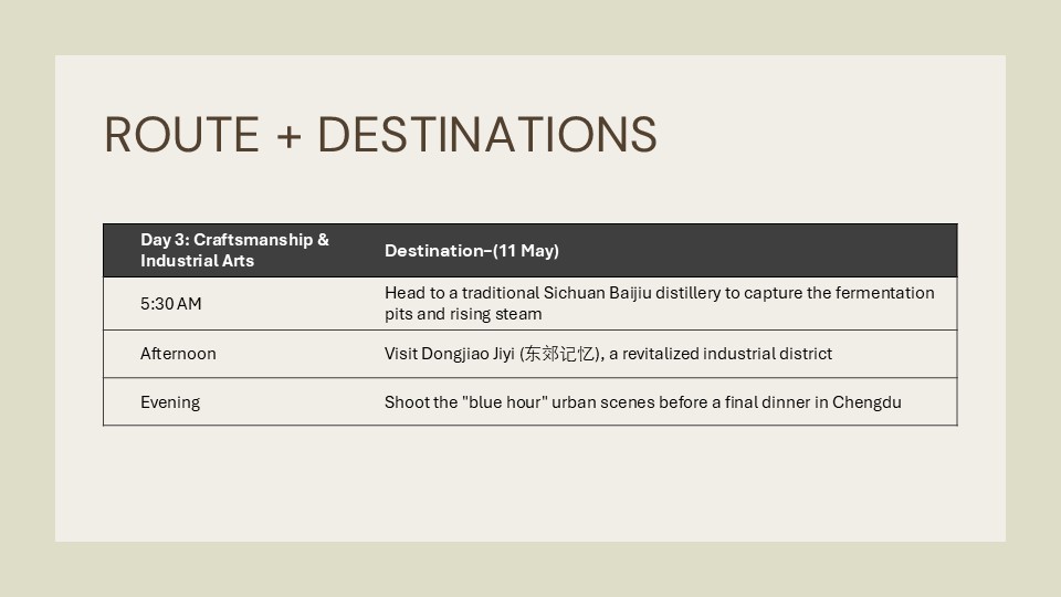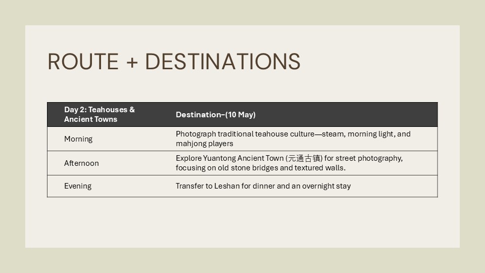 The Sichuan Documentary Trail Ready for an early-access pass to China’s most photogenic corners? This four-day sprint is designed for photographers who live for the "blue hour" and the perfect candid shot. We’re hitting the ground running—weaving through historic stone bridges, documenting the raw craftsmanship of liquor distillers, and capturing the faces of Chengdu’s legendary teahouse culture. It’s early mornings, late nights, and a non-stop pursuit of the visual stories that most tourists never see.